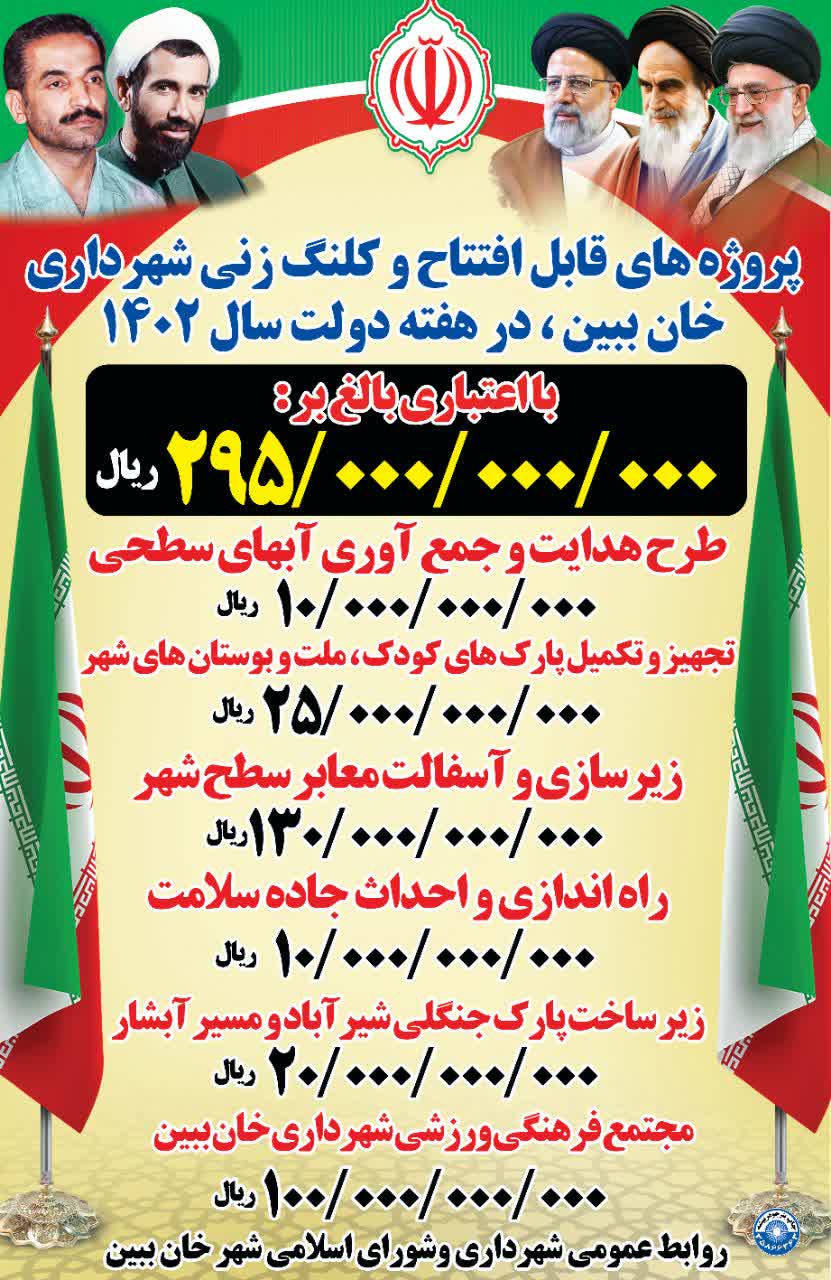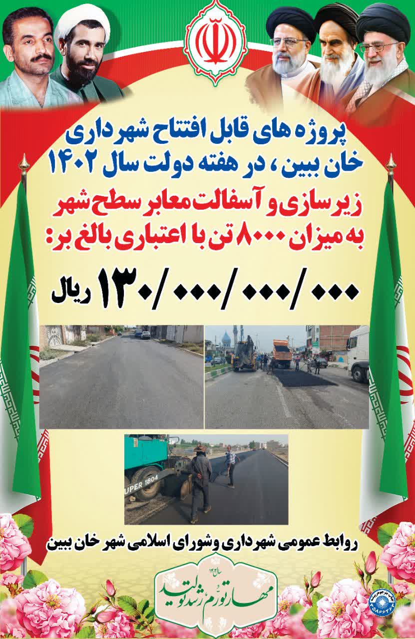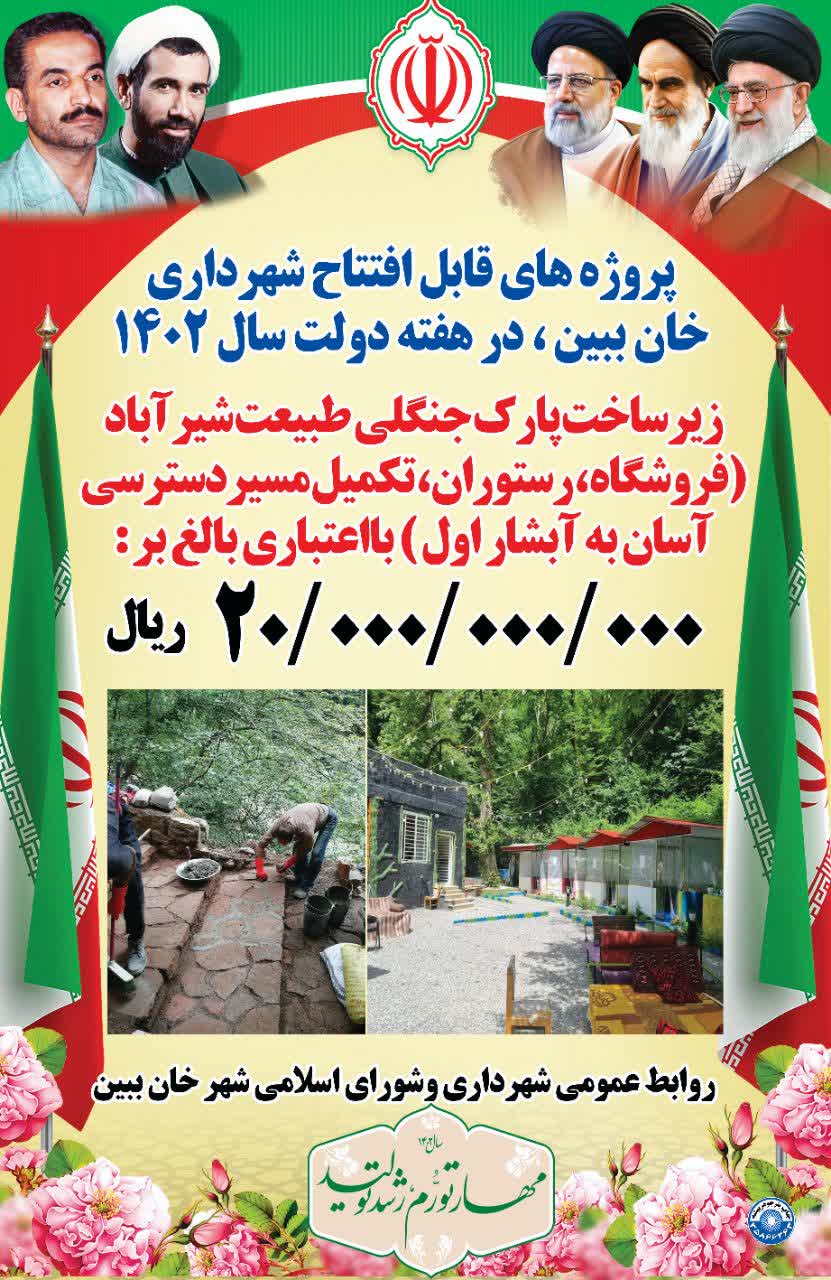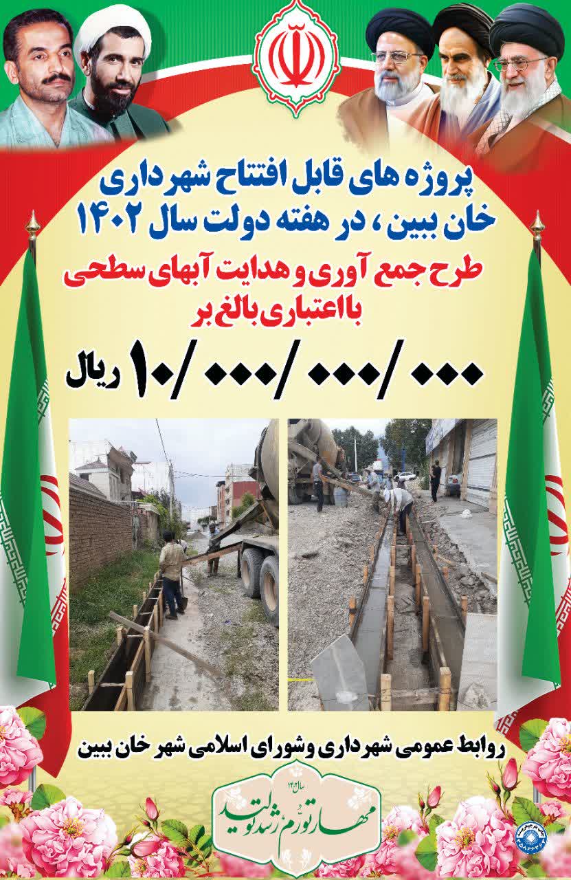 به گزارش واحد روابط عمومی شهرداری و شورای اسلامی شهر خان ببین، مهندس سعید اسماعیلی شهردار خان ببین نسبت به افتتاح پروژههای شاخص عمرانی در هفته دولت اشاره و اظهار داشت: در سطح شهر خان ببین شش پروژه شاخص شهری با اعتبار بالغ بر بیست و نه میلیارد و پانصد میلیون تومان به بهرهبرداری رسید؛ وی ادامه داد: از ویژگیهایی این تخصیص اعتبارات توجه ویژه به نقاط کمتر توسعه یافته شهر است.